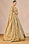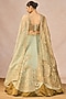 Featuring a sage green lehenga in tissue base with kashmiri kali, chaand and bagh-e-noor embroidery. It is paired with an embroidered corset-style blouse, two dupattas in tissue and sheer organza having fan-golden embroidery and a can-can. Elevate the look with kundan or statement jewellery, paired with a chic potli bag and elegant heels for a polished finish. Perfect for wedding festivities, mehendi, or day-time celebrations.
