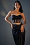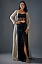 Featuring a black corset in mashru and net base with hand embroidery. It is paired with a draped skirt and light gold jacket. Accentuate with statement jewellery and heels for a festive occasion or sangeet ceremony.