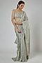 Featuring a dusty green pre-stitched saree in fuji crepe base with sequins embroidery. It is paired with a tulle blouse. Accentuate it with statement jewellery, a potli bag and embellished heels, ideal for a festive occasion, mehendi, wedding or engagement ceremony.