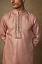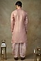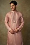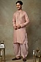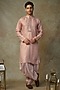 Featuring a peach kurta in tissue base with embroidery. It is paired with striped dhoti pants. Perfect attire for a festive occasion or sangeet ceremony, exuding traditional charm and elegance.
