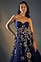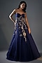 Featuring a navy blue gown in net base with 3D embroidery. Accentuate with statement jewellery and heels for your sangeet or reception ceremony.