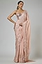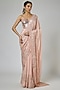Featuring a peachy pink pre-stitched saree in fuji crepe base with floral embroidery. It is paired with a tussar silk blouse. Accentuate it with statement jewellery, a potli bag and embellished heels, ideal for a festive occasion, sangeet, wedding or engagement ceremony.