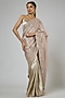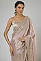 Featuring a pink and silver pre-stitched saree in pure handwoven jacquard tissue and silk base with zardosi embroidery. It is paired with a jacquard tissue corset blouse. Accentuate it with statement jewellery, a potli bag and embellished heels, ideal for a festive occasion, sangeet, wedding or engagement ceremony.