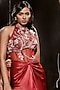 Featuring a red corset dress in mashru and net base with hand embroidery.