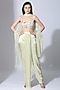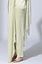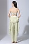 Featuring a sage green pant saree in mashru and tabby silk base. It is paired with an embroidered bustier and a scarf. Accentuate it with minimal jewellery and heels for mehendi or pre-wedding ceremonies.