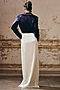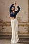 Featuring a blue blazer in mashru base. It is paired with a white skirt. Accentuate it with dangler earrings and heels for a cocktail look.