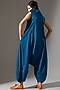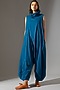 Featuring a blue jumpsuit in cotton base with high collar and balloon pants.
