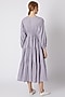 Featuring a lavender tiered dress in cotton base with drawstring bow-tie at the waistline. It has dark blue stripes and bat sleeves.
