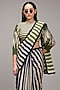 Featuring an off-white top in handwoven cotton base with hand block stripe print and pleats detailing, elasticated hems. It is paired with a mul cotton saree adorned with fringe tassels detailing. Style with tinted sunglasses, minimal jewelry, and heels for a chic contemporary look. Perfect for festive look.