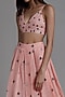 Featuring a pink handwoven lehenga in pure linen base with thread embroidery. It is paired with a matching bralette.
