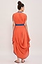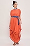 Featuring a rust draped cowl dress in handwoven cotton base with ribbed collar and embroidery. It is paired with a matching inner and a contrasting belt. Accentuate it with dangler earrings and heels for an evening look.
