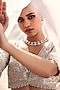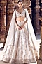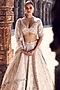 Matsya presents an ivory lehenga in raw silk base with a v-wing belt detail, including gota, dori, sequins and pearl hand embroidery. It is paired with an embroidered blouse and a net dupatta. Style it with statement jewellery and heels for a bridal look.