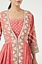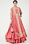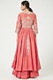 Featuring a peach lehenga in chanderi silk base. It is paired with a matching blouse and a jacket.