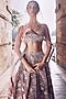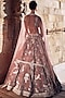 Matsya presents a pink lehenga in velvet base with silver dori hand embroidery. It is paired with an embroidered blouse and a net dupatta. Style it with statement jewellery and heels for a complete bridal look.