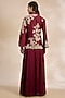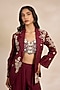 Featuring a red jacket in raw silk chanderi base with aari and resham embroidery. It is paired with a blouse and a skirt. Style it with dangler earrings, a clutch bag and heels for a festive occasion, wedding, engagement or sangeet ceremony.