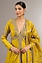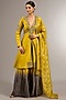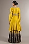 Featuring a yellow short anarkali in chanderi silk base with scalloped neckline, sequins work, aari and resham hand embroidery. It is paired with ombre sharara pants and a tissue banarasi dupatta having border detail. Accentuate with statement jewellery and heels for a festive occasion, haldi or engagement ceremony.