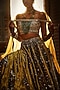 Featuring a yellow winged lehenga in velvet base with kachi dori, swarovski crystal and zardosi embroidery. It is paired with a matching blouse and a dupatta.