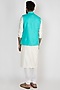 Featuring an aqua blue nehru jacket in linen base with running stitches. It has a cotton silk underlining.