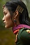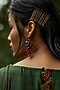 Featuring a pair of multi-colored earrings in assorted scrap fabric base with potli buttons, metal trims, and pom-poms.
