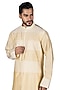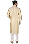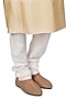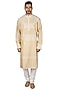 Featuring a beige kurta in katan silk base. It is paired with off-white churidar pants. Perfect attire for festive occasion or pooja ceremony, exuding traditional charm and elegance.