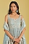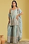 Featuring an ice blue kurta in tissue base with floral jaal, zari and resham embellishment. It is paired with a gharara and a dupatta. Accentuate it with statement jhumkas and embellished juttis for a graceful festive look, perfect for wedding functions or cultural celebrations.