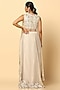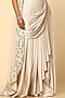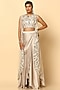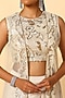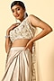 Featuring an ivory draped skirt in imported satin base. It is paired with a pitta work blouse and a net cape. Accentuate with dangler earrings and heels for a sangeet or festive ceremony.