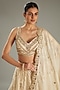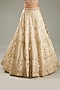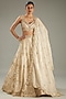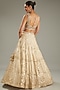 Featuring a light gold lehenga in tissue base with sequins, nakshi and mirror work. It is paired with a blouse and an organza dupatta. Accentuate it with statement jewellery and heels for a wedding or engagement ceremony.