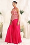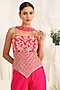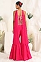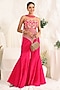 Featuring a magenta short corset in net base with sequins and cutdana hand embellishments. It is paired with silk sharara pants and a net dupatta. Accentuate it with dangler earrings and heels for a festive occasion, reception, sangeet or wedding ceremony.