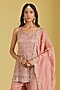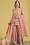 Featuring a peach kurta in tissue base with floral, resham and sequins embellishment. It is paired with an embellished gharara and a dupatta. Accentuate it with statement jhumkas and embellished juttis for a graceful festive look, perfect for wedding functions or cultural celebrations.