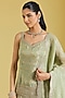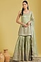 Featuring a pista kurta in tissue base with embroidery. It is paired with an embroidered gharara and a dupatta. Accentuate it with statement jhumkas and embellished juttis for a graceful festive look, perfect for wedding functions or cultural celebrations.