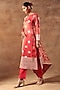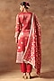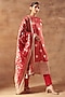 Featuring a red straight long kurta in tissue jacquard base with zari and sequins work. It is paired with silk pants and a tissue jacquard dupatta having tassels. Accentuate it with statement earrings and block heels for a festive occasion or wedding ceremony.