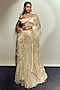 Featuring an ecru golden lehenga saree in tulle base with embroidery. It is paired with an embroidered blouse. Accentuate it with jewellery, a sleek clutch and heels for a graceful look. Perfect for special celebrations, wedding or festive ceremony.