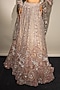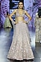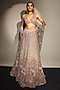 Featuring a rose gold lehenga in tulle base with embroidery. It is paired with an embroidered blouse and a dupatta. Accentuate with statement earrings and heels for weddings or sangeet ceremonies.