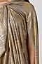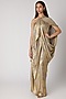 Featuring a golden draped off-shoulder gown in lycra base with foil print and a middle knot. It has a flared panel extending as the right sleeve.