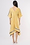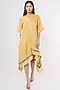 Featuring a yellow draped asymmetrical dress in sandwash satin base with grey border.