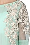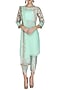 Featuring an aqua blue straight kurta in silk satin base with embroidery. It is paired with dhoti pants and organza dupatta.