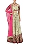 This set features a mint green flared kalidaar skirt in georgette base with pink thread and mirror embroidery all over the ghera. It comes with mint gorgette thread work and mirror work blouse and pink dupatta.