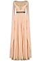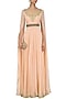 Featuring a peach gown in georgette with gold embroidered neckline and cape sleeves.