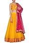 Featuring a yellow pleated lehenga skirt in georgette base with mirror and thread embroidery. It is paired with matching blouse in dupion silk base and hot pink dupatta in organza base.