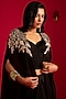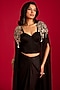 Featuring a black cape jacket in modal satin and organza base with hand embroidery. It is paired with a corset and a draped skirt. Accentuate it with polki earrings and mules for a sangeet or wedding ceremony.