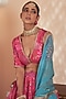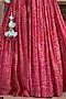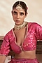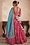 Featuring a pink lehenga in bemberg silk base with print. It is paired with a blouse and a bemberg organza hand-embroidered dupatta. Accentuate it with dangler earrings and heels for a wedding, sangeet or engagement ceremony.