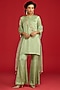 Featuring a sage green kurta in modal satin base with hand embroidery. It is paired with flared pants and a dupatta. Accentuate it with polki earrings and mules for festive gatherings, mehendi ceremony or daytime functions.