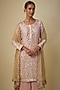 Featuring a baby pink kurta in raw silk base with gota, ribbon, thread, sequins and tube embroidery. It is paired with chanderi striped pants and a golden net dupatta. Accentuate with statement earrings and heels for festive occasions or wedding ceremonies.