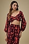 Featuring a black bustier crop top in crepe base with orange print. It is paired with flowy, wide-legged pants. Effortlessly chic and breathable, this set is perfect for sun-soaked getaways. Wear it together for a bold look or style each piece separately for versatile vacation vibes.