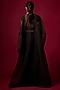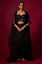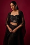 Featuring a black sheer cape in organza base with crystal work. It is paired with a satin draped skirt and a choli having under-bust peep cut detail and embroidery. Accentuate it with dangler earrings and strappy heels for a sangeet, wedding or cocktail soirees.