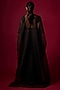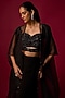 Featuring a black sheer cape in organza base with crystal work. It is paired with a georgette ruffled skirt and a choli having under-bust peep cut detail and sequins embroidery. Accentuate it with dangler earrings and block heels for a sangeet, wedding or cocktail soirees.