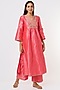 Featuring a coral pink kurta in raw silk base with gold detailings. It is paired with matching pants.
