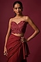 Featuring a deep red ruffled pre-draped saree in georgette base. It is paired with a sculpted embroidered bustier. Accentuate it with dangler earrings and strappy heels for a sangeet, wedding or cocktail soirees.