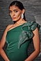 Featuring a forest green one-shoulder ruffled gown in stretch suiting base with embroidery.