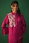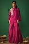 Featuring a magenta pink asymmetric kurta in satin linen base with embroidery and one-side cut detail. It is paired with sharara pants. Accentuate it with statement earrings and heels for a festive look.